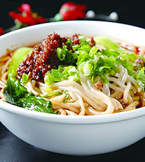 担担面是由面粉擀制成的面条,面色泽红亮,面条细滑,主要佐料有红辣椒油、肉末、川冬菜、芽菜、花椒面、红酱油、蒜末、豌豆尖和葱花等,口味油香麻辣,香气扑鼻,十分入味,受到各地人民的青睐。