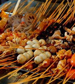 麻辣烫是麻辣火锅的前身,也可说是火锅的简化版。吃的时候,将一大把竹签穿起的肉和菜放进翻滚的红汤中,与火锅所使用的食材在一般无二,与火锅最大的不同就是简便快捷,分为新派麻辣烫和传统麻辣烫两派。