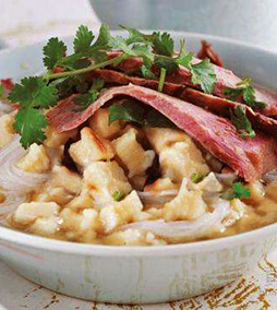 三鲜煮馍的原料是丸子、发好的面皮、细皮白肉片,加之用上好的肉骨、鸡鸭肉调好的白汁汤,经厨师用高汤、蒜苗、粉丝把馍煮好,碗中三鲜颜色鲜亮,高汤色白,香气四溢,颇受消费者欢迎。